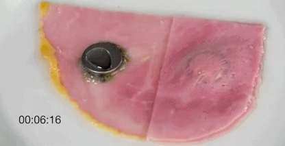 电池刚一接触肉片就发生剧烈的腐蚀反应,两个小时后,实验人员取出电池,两片火腿已经被腐蚀透了,只留下两个大洞。