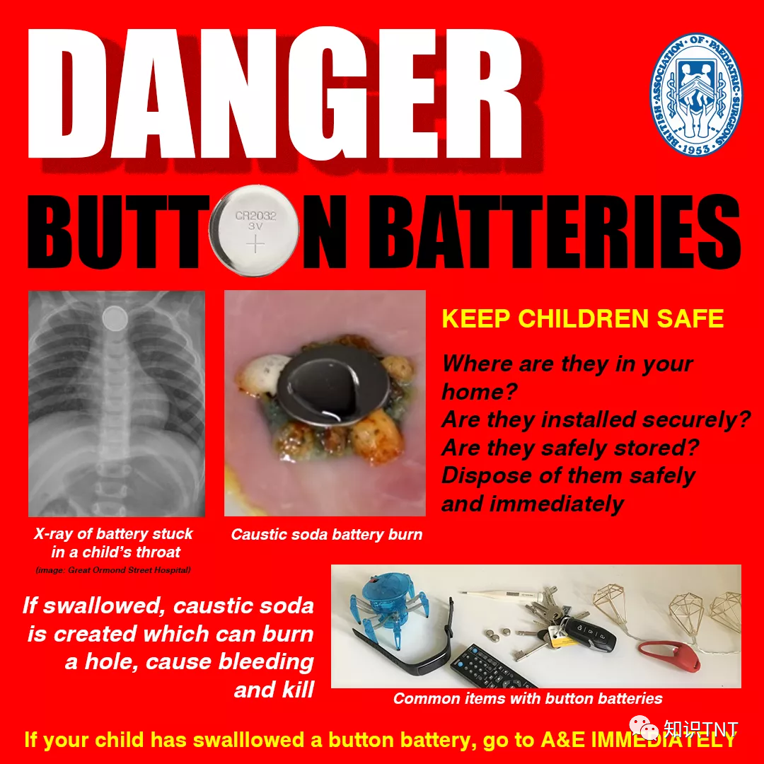 据统计,美国每年有3500名患儿因误食纽扣电池进医院,因为纽扣电池对消化道造成的不可逆伤害,甚至威胁到生命,世界各国针对性的宣传纽扣电池的危害,提醒广大家庭特别注意。