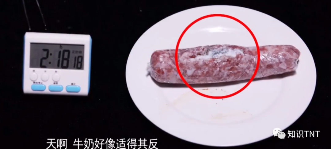 相比之下,我国湖南卫视做的实验宣传片稍好一些。实验材料使用的是肉肠,模拟电池进入食道的场景,肉肠里含油、含水、含盐,电池放进去也马上起了反应,这样的设计与BBC的实验一样,夸大了实验结果。不过,它创新的地方在于后续模拟了牛奶倒入的情况,反应更加剧烈了,证实了前文提到的牛奶是错误的施救方式。