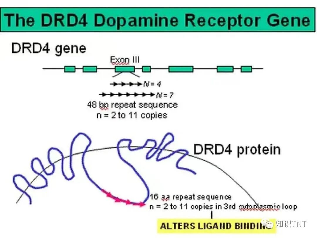 de DRD4基因也称之为多巴胺受体D4,每个人身上都有,是由2-11个单元组成,如果一个人身上含有7个及以上的重复单元就称为7R+,少于七个就称为7R-。这种基因是由美国纽约州立大学研究人员通过对180个年轻男女进行恋爱观和过往情史的详细了解汇总后,并对实验对象进行DRD4基因检测,发现这种基因对大脑多巴胺含量有极大影响。