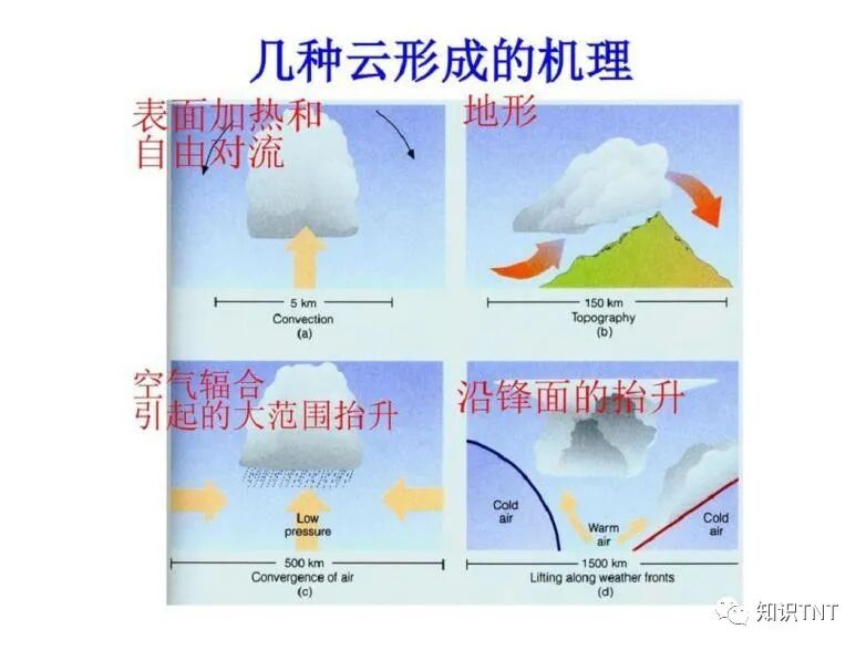 其他几种比较常见的情况是气流把这些水蒸气送上去冷凝成的云,比如气旋、对流、地形隆起等等。
