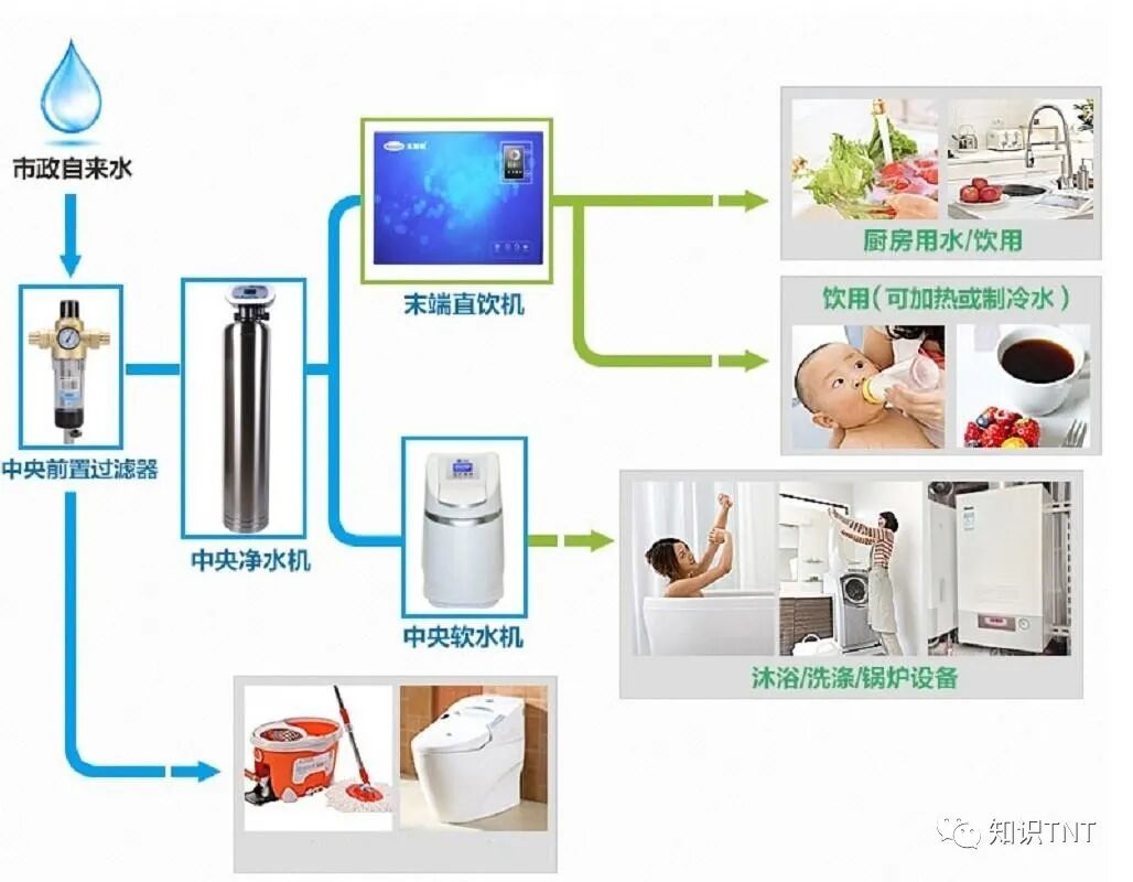 前置过滤器是初步过滤装置,为的是让其他净水结构工作负荷小一些,提高滤芯的使用寿命。因为厨房用水直接接触食材,所以厨房用水和直接饮水是一个级别的。用于沐浴和洗涤的水只需处理到软水级别就行。产生的废水可以用于排污和地面清洁。