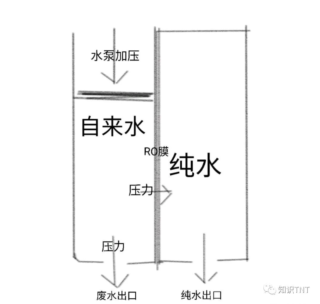 为什么会产生废水,这是反渗透压的作用。自来水来到滤芯处,净水想从另一边流出,需要对自来水进行加压,让水和其他矿物质从缝隙中挤出来。自来水这边压力大到挤不动了,这部分水就成为了废水,里面的盐浓度会比较高。另一部分废水来自于冲刷滤芯的自来水,为了防止滤芯过度堵塞,延长它的使用寿命。