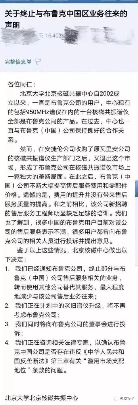 2018年,北大核磁共振中心一台布鲁克核磁共振仪出了故障。校方向仪器生产方的国外厂商发出售后要求,然而厂商却狮子大开口,需要北大先支付23万元费用,再前去进行维修。