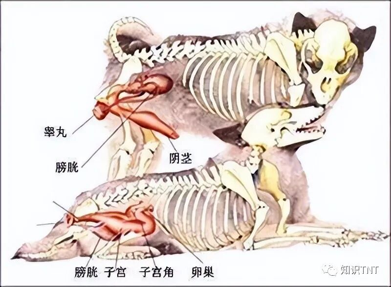 尽管品种各不相同但作为“灰狼”的亚种,生殖系统是一样的。首先从公狗来看,它们的睾丸比较小,呈椭圆形,是产生精子和雄性激素的器官。一般情况下,我们可以通过睾丸大小来判断狗狗处于一种什么阶段。睾丸变大且软,就是发情期,睾丸变小且硬就是发情期。交配器官“丁丁”比较特殊,第一是有一个8~10厘米的骨头,第二是有两个发达的海绵体;再来看母狗,正常的卵巢、子宫、输卵管等等,唯一不同的是狗的子宫属双角子宫,呈“V”字形。由于子宫角比较发达,因此一窝最多可产十几只幼犬。