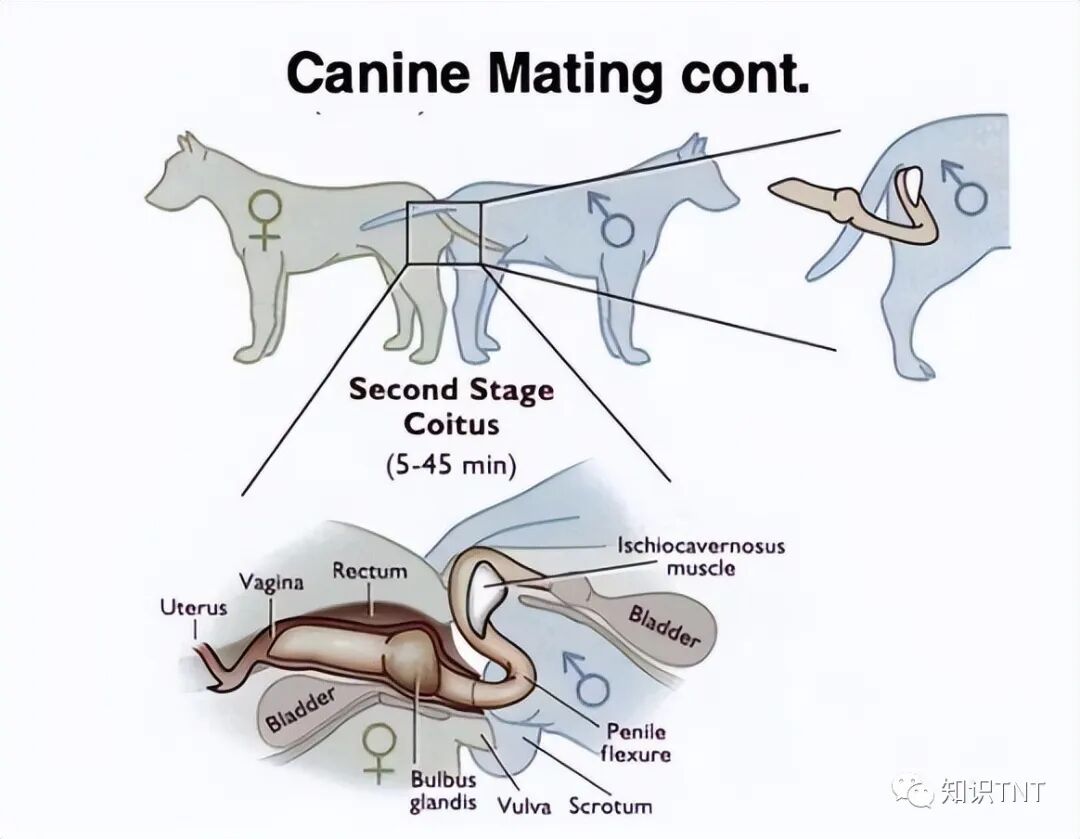 同样很好奇的是:在“背靠背”的长时间动作里,为什么拔不出来呢?这是由于“丁丁”的特殊性。第一,“丁丁”上有一个8~10厘米的骨头,它在转身之后就直接卡在彼此的生殖器上,保证这一状态;第二,“丁丁”上有两个海绵体,在交配过程中,海绵体充血膨胀,卡在母狗的耻骨联合处,使得整个“丁丁”不能拔出且呈栓塞状。