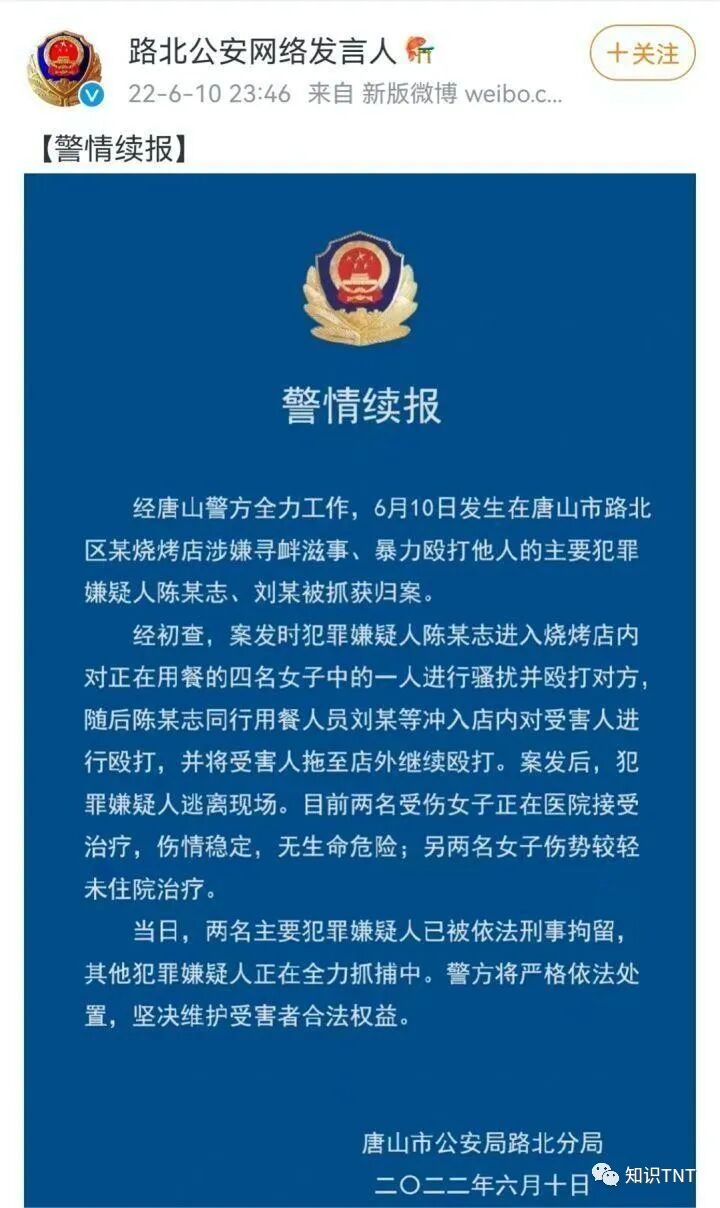 唐山打人案发生后,警方在第一时间介入并发布了警情通告。然而这则不痛不痒的“例行公事”通告显然不能服众。一时间指责声质疑声层出不穷,有人质疑公安局出警慢,有人说想必施暴者在警察局“有人”。