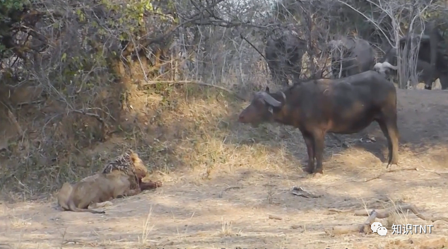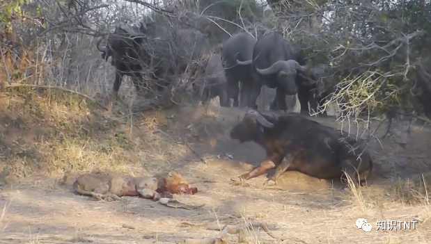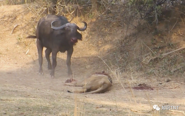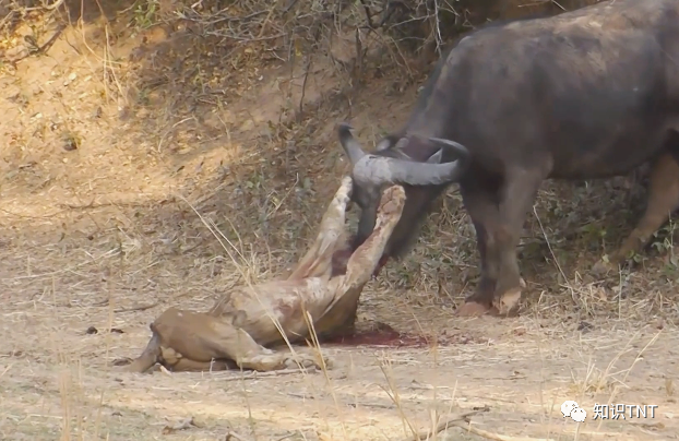 一只野牛发现了躺在地上的雄狮,不仅攻击雄狮,还多次将雄狮顶飞