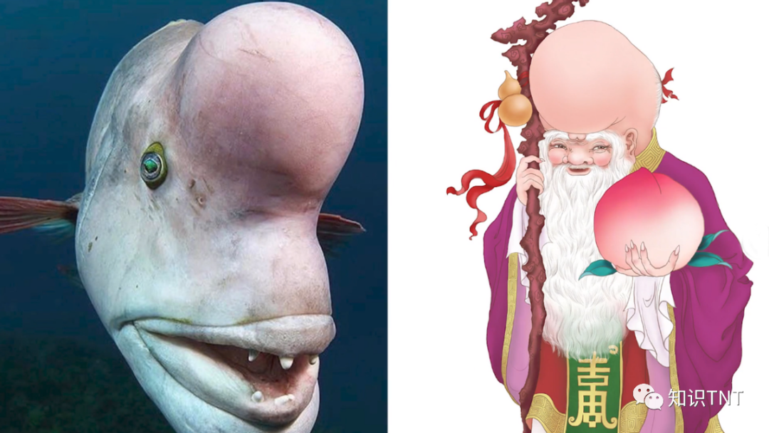 这就是突额隆头鱼,它们长着一个巨大的额头和下巴,丰润的圆脸和其他变形与很不同,乍一看之下真的会把它当作人,尤其和咱们神话里的“老寿星”很像。但其实,幼年时期的隆头鱼长得还没有这么奇特,大额头和下巴都没有发育。它们全身金黄,中间有一条长长的白色纹路对应着脊椎骨,看上去和普通鱼类没有多大区别。等到青春期以后,雌鱼的特征开始凸显出来,全身变成黑褐色,身体也基本属于扁平状态,额头和下巴依然没有发育。