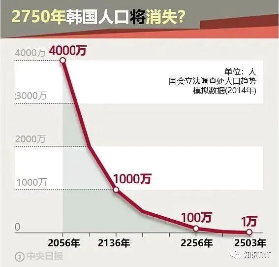 这是一个非常恐怖的数据,真的有可能会像科尔曼预言的那样,韩国将直接从地球上消失。有专家做出一个十分大胆的预言,到2750年,韩国人将消失。是什么原因导致韩国人口增长率持续低迷,甚至出现负数的呢?最首要的原因就是年轻人生活压力大,不管是结婚还是生孩子,都是一笔巨大的费用支出,年轻人把精力和时间都花在赚钱上,结婚谈恋爱的欲望自然就会降低,年轻人都不愿意结婚了,哪里来的新生人口。其次就是男女比例失调,据统计,韩国男女比例为104.9,也就是说,每有1000个女孩,就有1049个男孩,男女比例不对等,结婚也会随之降低。最后,韩国人口老龄化问题严重,据统计,韩国老年人接近900万,占总人口的六分之一。专家预测,三年后,韩国65岁以上高龄人口比例将会达到五分之一,进入超老龄社会。其实,韩国存在的问题,在全世界范围内广泛存在。就目前而言,我国似乎也在步韩国的后尘,年轻人生活压力越来越大,不意愿结婚生子,只想安心搞钱,甚至到了谁跟我提结婚就跟谁急的程度。2021年,我国新生人口为1062万,死亡人口为1014万,增长人口为48万,创60年来新低。可能有人觉得48万也挺多的,但这是在14亿人口的基础上啊!要知道在2018年,我国人口净增长为530万,也就是说,2021年的人口净增长数不到2018年的十分之一。所以我国的生育率也不得不拉起警戒线,专家预计我国2022年新生人口数可能还会在2021年的基础上下降5%,未来几十年,可能会迎来负增长。