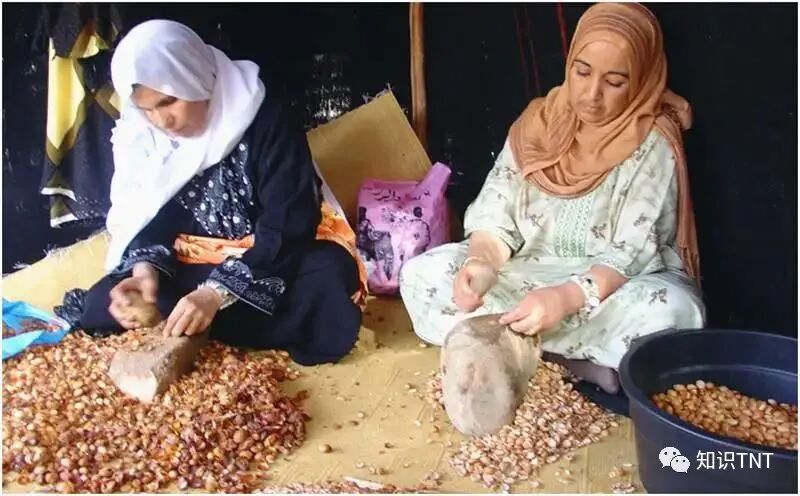 山羊吃饱了肚子,妇女得到了果核,而而山羊会上树的奇景,也吸引到了不少游客特地前来观光,拉动了一点当地的GDP,一举三得。那她们收集这种很难处理的阿甘果究竟要做什么?实际上,这种果核还需要用石头砸开才行,因为她们只需要里面的果仁。而这些果仁经过榨取后,会变成非常珍贵的油,里面富含的维生素E是橄榄油的2倍,亚油酸的含量也非常丰富,不仅可以用作食用油,而且还是全球出名的美容圣品。