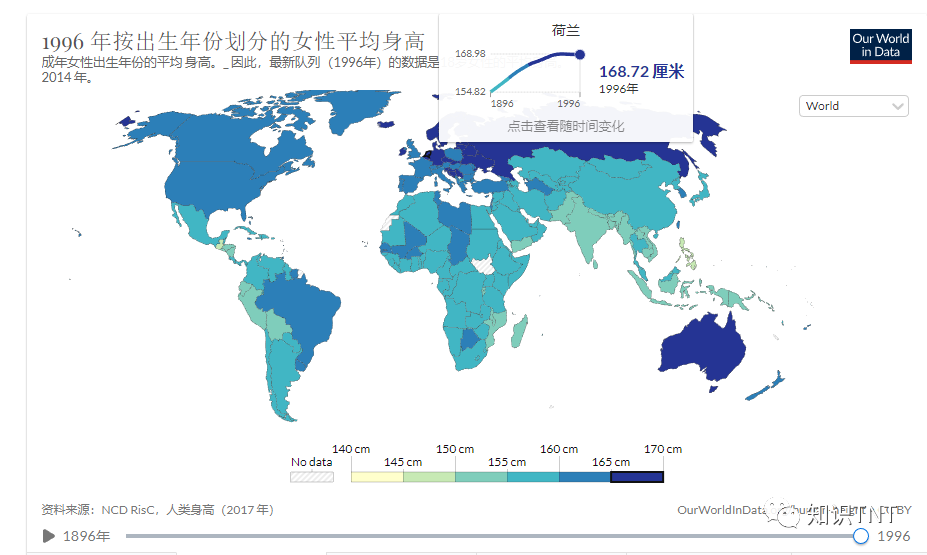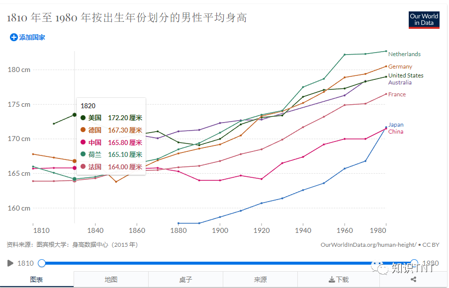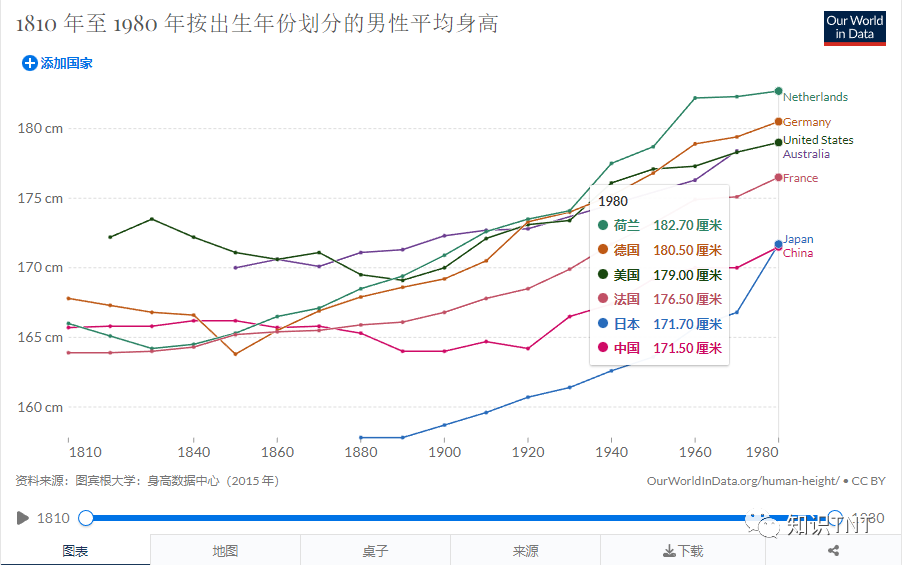 根据Our World in Data的统计数据,1820年出生的荷兰男性的平均身高只有165.1厘米,而中国有165.8厘米。 但根据西班牙《20分钟》日报网站的报道,到了2021年的时候,荷兰男性的平均身高已经达到了182.5厘米。也就是说这200年间,荷兰男人的平均身高增加了17.4厘米。