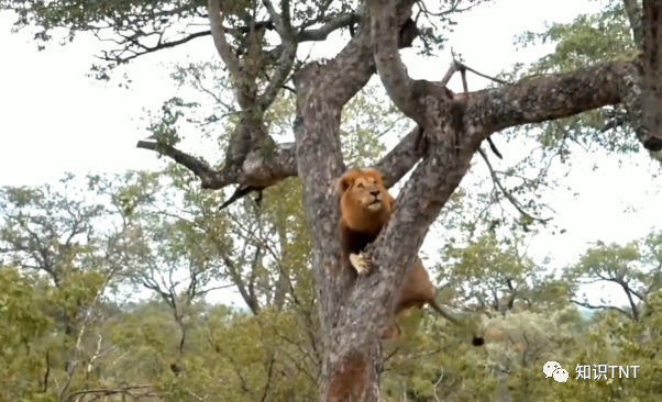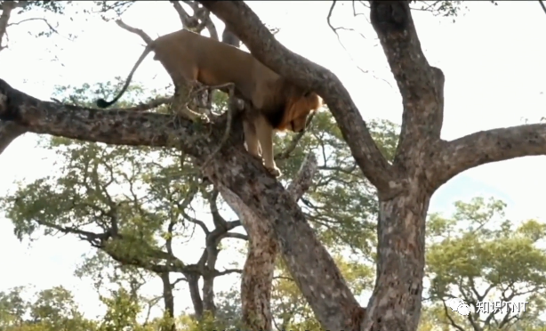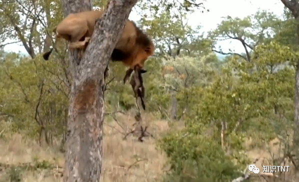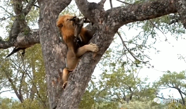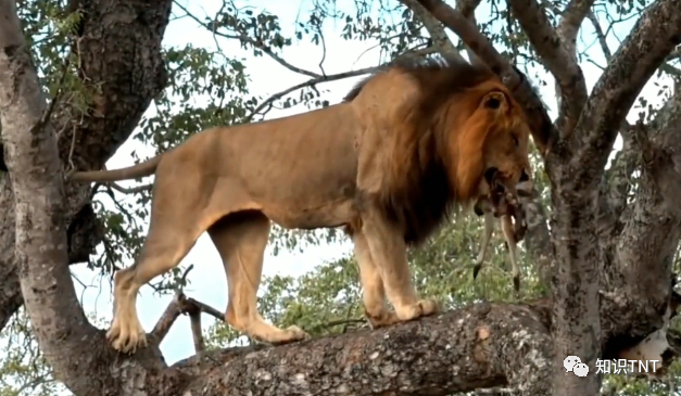 在发现花豹藏在树上的食物后,它猛然一跳抱在树上,缓慢爬到了树杈上,好在花豹藏食物的地方并不高,雄狮很快就叼走了食物,只不过在下树时,雄狮犯难了,犹豫了很久才调转身形,纵身一跃跳了下去,好在有惊无险。