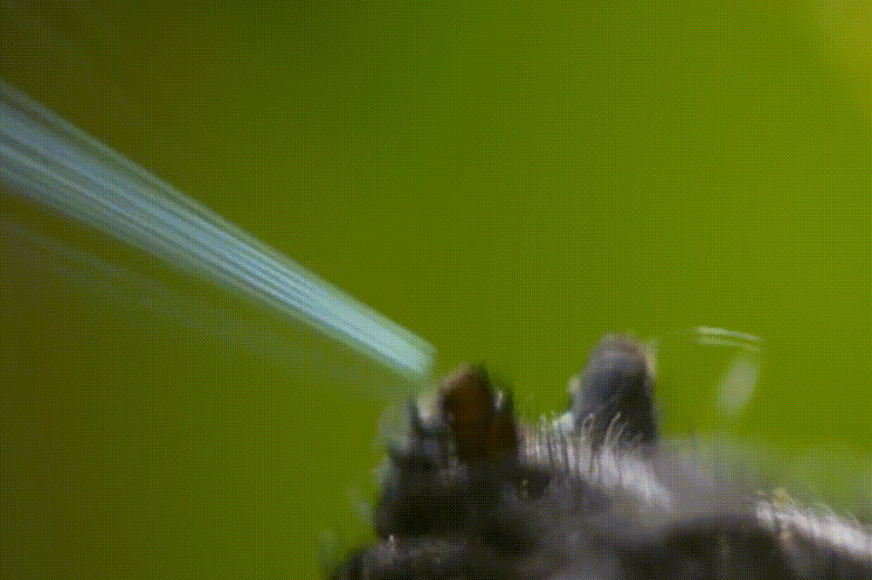 吐丝器的根部与丝腺相连,内部储存着大量的蛋白质,当它们需要“吐丝”的时候,就会调动丝腺分泌出蛋白质粘液喷射出来。潮湿的粘液遇到空气迅速干燥,并且在内部压强的作用下,被源源不断地拉成蜘蛛丝。