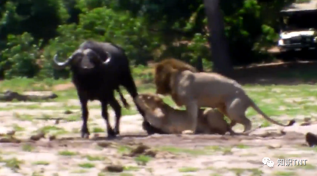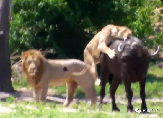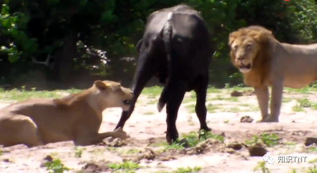 一头母狮正在狩猎水牛,雄狮却站在一旁看着,丝毫没有上去帮忙的意思,母狮好不容易咬住水牛后肢,雄狮却直接骑在母狮身上,做出了羞羞之事。