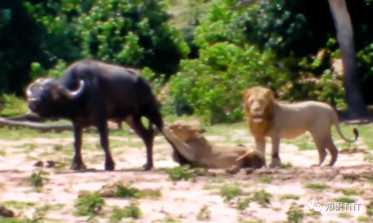为了避免非洲野水牛逃走,母狮牢牢咬住了野水牛的后肢,自己则躺在地上,试图慢慢耗尽非洲野水牛的体力。整个战斗过程,雄狮都亲眼目睹了,但却没有上前帮忙,反而趁着母狮躺在地上之时,来到母狮背后,想要做一些羞羞之事,但却遭到了母狮拒绝反抗。雄狮直接躺在了一旁,似乎想要看看母狮的狩猎技巧如何。