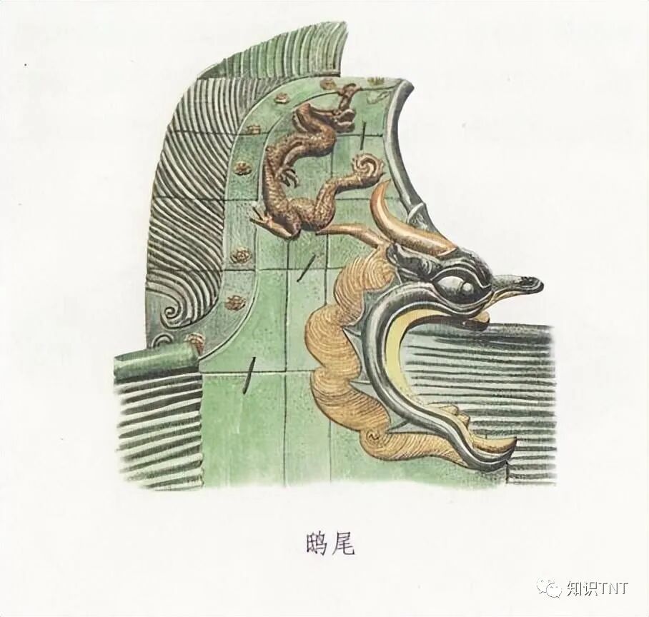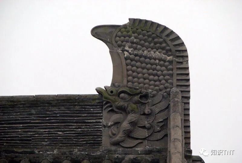 蚩尾通常安装在屋脊的主脊和垂脊的衔接处,或者正脊的两侧,表面会有一层金属涂层,里面则埋上铁丝或者铜制品与地面连接,就能起到把雷电流引到地下的作用。