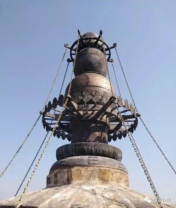 然而大部分塔刹的设计——居中插入塔身的铁杵,四周的圆环、月牙、宝珠等装饰设计,再加上数根用以固定的铁索,这不妥妥就是一个古代的“接闪杆”(俗称避雷针)嘛。