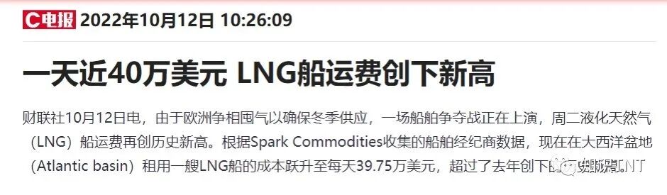 由于严重的供不应求,LNG船的租金也在疯狂上涨,已经从之前的三四万美元一天翻了好几番,目前是十几万美元一天,部分地区甚至高达几十万美元一天。