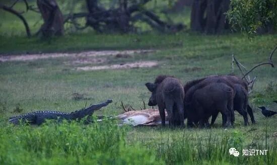 其次野猪属于群居性动物,一个族群中有4-10只,最多6-20只,当它们遭遇到危险时,会一起对付敌人。并且野猪的护仔性十分强,如果幼仔被攻击,即便是与对手实力悬殊,野猪也会不顾生死发起反击。比如文中开头提到的场景,很明显这只沼泽鳄试图捕捉小猪仔,被旁边的几头野猪发现了,这才遭到野猪的反击。由于野猪数量众多,所以它们并未逃跑,而是对着沼泽鳄不断冲撞,直到将沼泽鳄赶回水里为止。此外,野猪是一种非常喜欢吃肉食的动物,当它们发现岸上的沼泽鳄捕食到猎物时,还会主动冲上去抢夺沼泽鳄的猎物。比如拍摄者就曾拍摄到4头野猪,主动抢食了沼泽鳄杀死的羚羊,沼泽鳄试图反抗,但却遭到了野猪冲撞,最终不得不放弃猎物。