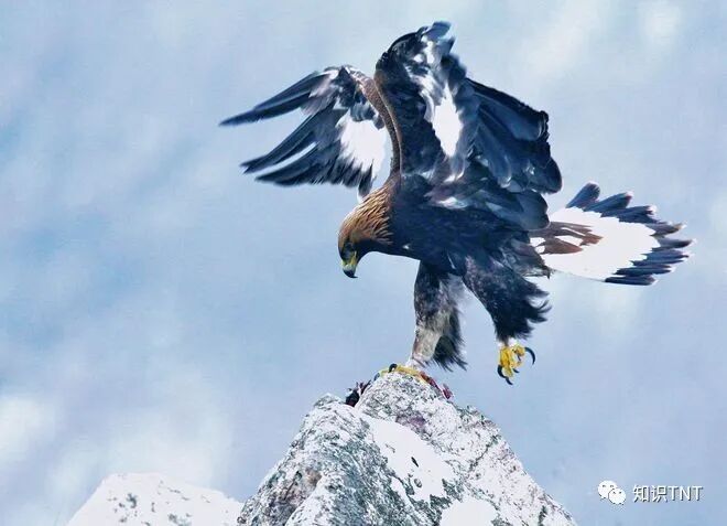 世界上比金雕体型大的猛禽也不是没有,但是金雕的外形却令人望而生畏。它被称为“天空之王”,是小型动物最害怕的空中顶级捕食者。金雕以突出的外观和迅猛有力的飞行而闻名,成年金雕的体长超过1米,翼展更是长达2米,它靠宽阔的翅膀来获得上升气流,能在空旷的高空和山谷峭壁上游刃有余地翱翔和滑翔。金雕的飞行速度也是数一数二的,最高可达每小时128-190公里,俯冲速度甚至达到了每小时322公里。当它们向下俯冲时会收紧翅膀呈现“V”型,减少自己的飞行阻力。双翼和尾羽的平衡能力让它在接近地面时可以稳稳地落在猎物身上不会受伤。