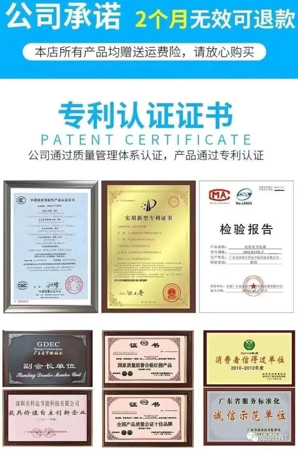 这些广告语让人看了就想点进去看一看,不点不知道,一点更糟糕,商品详情页不仅有浮夸的广告语,还有众多的“专利证书”,什么检验报告、专利证书、五百强企业,可谓是应有尽有、一应俱全。