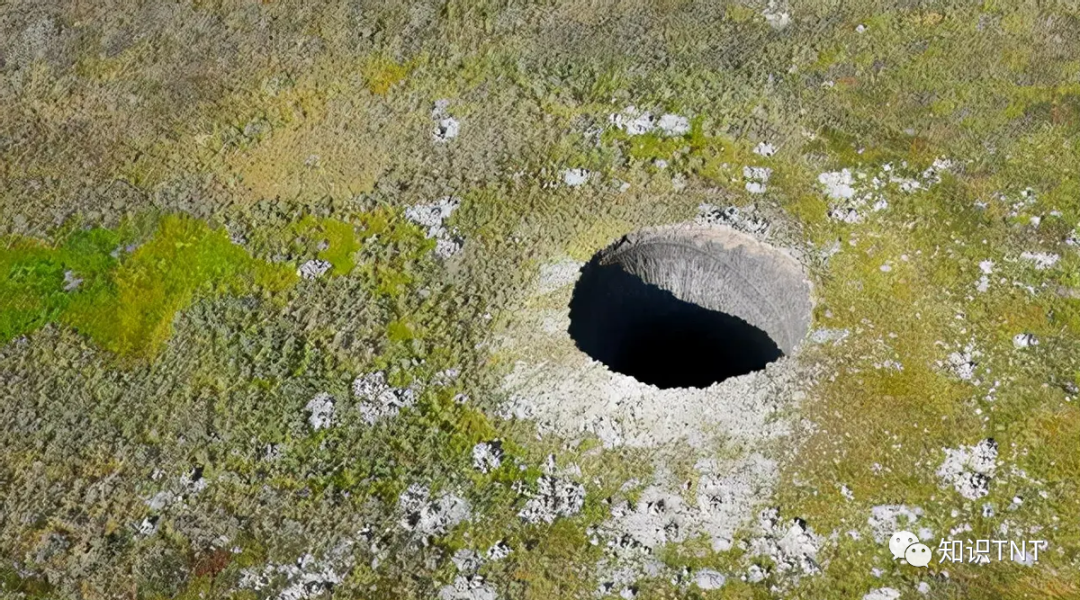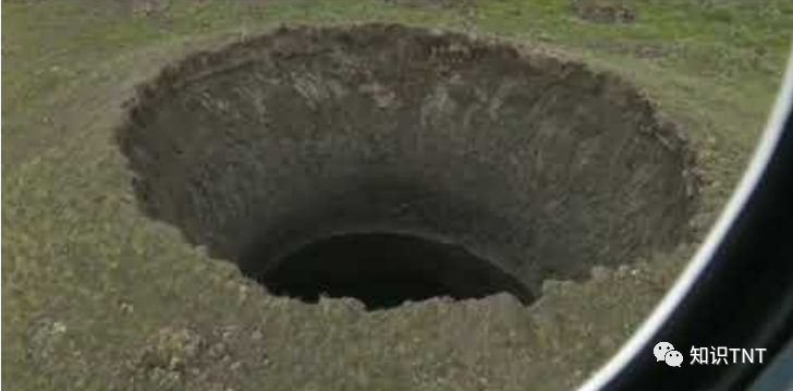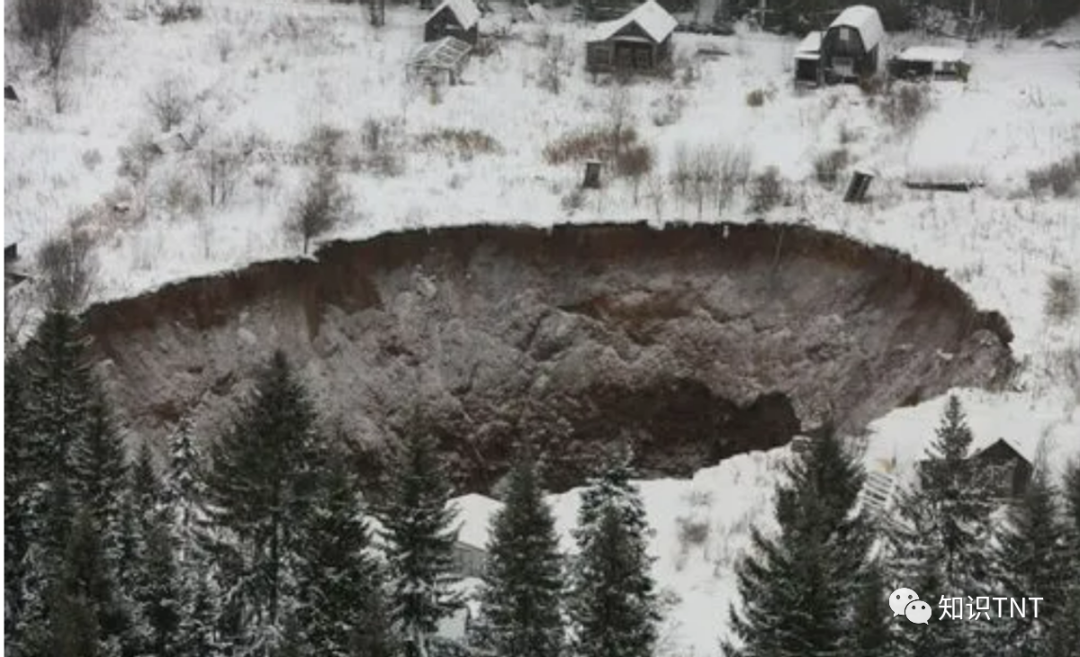 由于冰的体积比水要小,冻土融化后自然就会往下塌陷。如此大规模的冻土都消融了,土层失去了支撑,自然一下子就塌陷出了一个巨大的天坑。