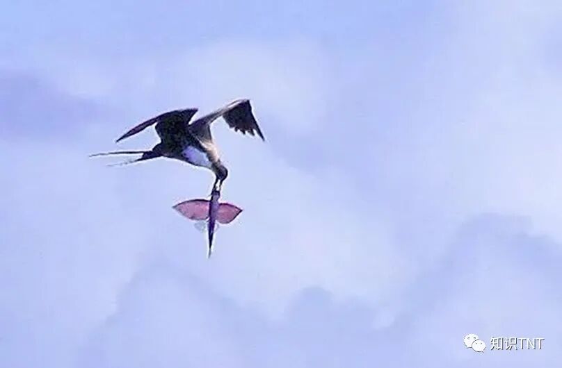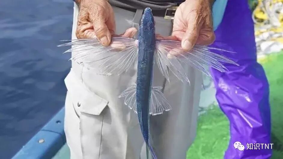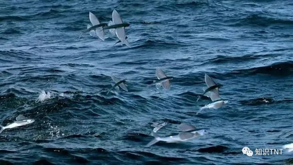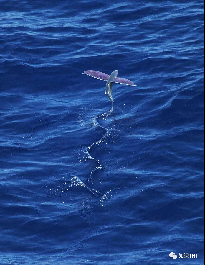 飞鱼,通常生活在热带和亚热带海面以下0-200米的透光层,它们体型很小,最大只能长到60厘米,大部分只有人类的手掌大小。不过和很多能够活上亿年的小生物一样,没有特殊的保命技能,只能靠繁衍让自己不至于灭绝。所以飞鱼的数量很多,经常成群结队的。同时出没的飞鱼,被金枪鱼、旗鱼和剑鱼等大鱼视为美食,常常可以见到它们在海洋里被追捕的场景。这时候,飞鱼就会展示出自己独特的“飞行能力”,企图摆脱捕食者的追赶。
