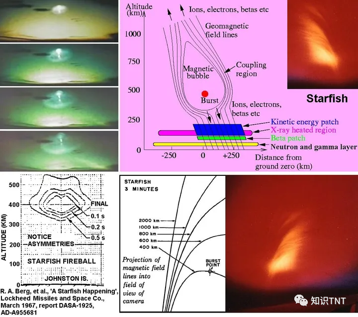 在夏威夷的人们看到,夜空的云层中出现了一道明亮的白色闪光,探测到它的初始速度是2000公里/秒,然后迅速变成一个不断扩大的绿球。随后,绿色的光变成了紫色暗淡下去,地平线上的整个天空开始出现明亮的红色火球,大部分星星已经看不见了。这个火球在1.2秒内迅速膨胀到了1840公里长、680公里宽。1分钟后,少部分蓝绿色和更多粉红色条纹出现在天空,持续了近30分钟。爆炸不仅以光和热的形式强烈涌现,还以伽马射线和X射线的形式,释放出了高强度辐射和电磁脉冲。它所产生的带电粒子开始与地球磁场进行相互作用,科学家们观测到了数千公里的蛇形极光,在爆炸几天后仍肉眼可见。随后,夏威夷出现了方圆数百公里的大面积停电,路灯熄灭了,雷达和导航系统中断了,电子通信完全停摆,连近地轨道上三分之一的卫星也瘫痪了。全世界都被美国的核试验吓到了,但是苏联人也不甘示弱,他们在3个月后,也将一颗30万吨级别的核弹发射到了高空300公里处引爆,直接导致哈萨克斯坦570公里长的电话线和1000公里的电力电缆被炸瘫痪。