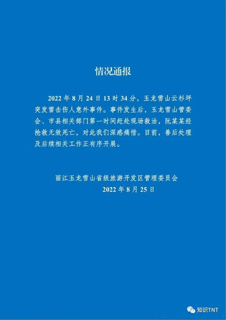 8月25日,玉龙雪山发生雷击事件,一对正在拍摄婚纱照的新人不幸中招,相关部门第一时间赶赴现场救治,新郎最终经抢救无效不幸身亡。
