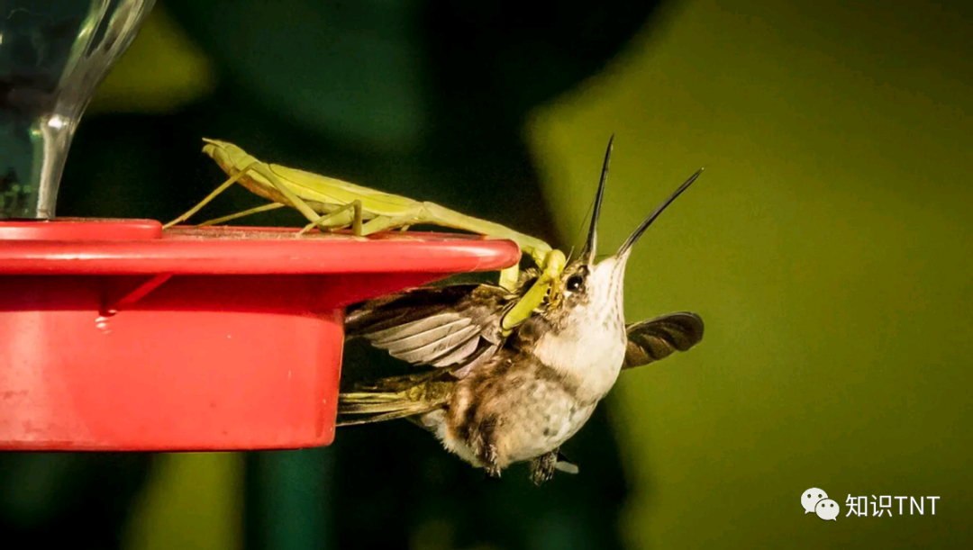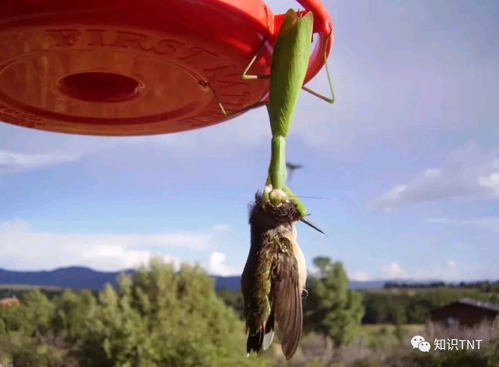 但这样的速度,在咱们大刀螳螂面前,却丝毫没有优势。一些美国人会在住宅门口,挂上一个专门为鸟类设置的取水器,在上部的罐子里装满了糖水,蜂鸟们只需要将自己尖长的嘴巴靠近洞口,就可以喝到里面的糖水。但同时,它们根本不会注意到,危险已经悄悄靠近。 螳螂非常善于埋伏,而且非常有耐心,大刀螳螂会站在取水器上,举起自己的两把“大刀”,一动也不动地站在那里,等待蜂鸟靠近。最主要的是,螳螂的速度比蜂鸟还要快上很多,还没等到猎物反应过来,螳螂就会迅速抓住猎物。 然后,螳螂就会紧紧钳住蜂鸟,从它们的胸部开始进食。但由于螳螂的嘴巴也比较小,往往要花上几个小时,才能将比自己体型更大的蜂鸟吃掉。在大刀螳螂成功入侵美国后,北美蜂鸟就成为了它们的主食,这让许多美国鸟类爱好者,对这种“残忍”的昆虫,十分痛恨。 同时,蜂鸟也是帮助传播花粉的重要鸟类,而大刀螳螂的出现,直接消灭掉了美国的一大花粉传播者,导致许多花卉数量减少。这让大刀螳螂在惹上鸟类爱好者后,又再次招惹上了植物爱好者。但这些都怪不得大刀螳螂,毕竟人家也是凭本事吃饭,谁让大刀螳螂的适应能力这么强呢。