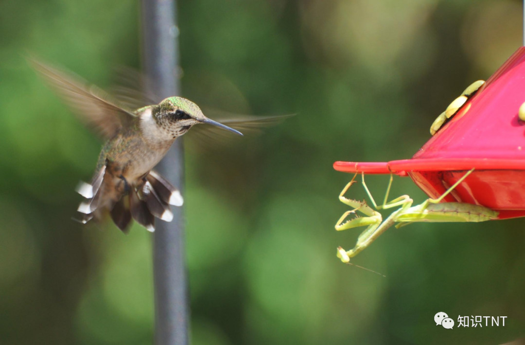 上世纪八十年代,美国进口了一批苗木,但因为美国海关的疏忽,根本没有发现在这些苗木上,还沾着一些细小的虫卵。直到螳螂已经完全孵化,并迅速在附近许多绿植中活动,美国人才终于发现了这些入侵者。 常说“螳螂捕蝉,黄雀在后”,但咱们国家的大刀螳螂,在入侵美国后,却来了一波反向操作,开始捕食起了北美蜂鸟。 蜂鸟是世界上最小的鸟类,在美国生活的蜂鸟就多达12种,它们身形娇小,毛色艳丽,受到许多鸟类爱好者的喜爱。蜂鸟翅膀的振动频率很高,每秒可达15—80次,就算在四五千米的高空,它们的飞行速度也可以达到每小时50千米,可见,它们的飞行速度可不低。