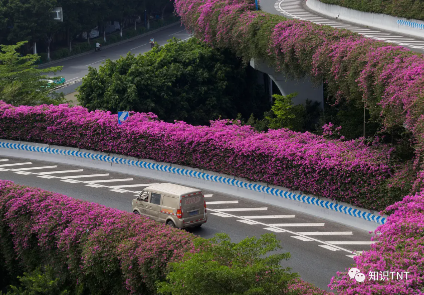 另外,虽然冬天爬山虎会枯萎,但大部分时间高架桥柱子上绿油油的一片,看起来会比较赏心悦目,尤其是对长途开车的司机而言,道路上的绿色植被能很好的缓解视觉疲劳,减轻驾驶压力。 冬天清理了枯萎的枝叶,等到来年,不需要多久爬山虎又会布满高架桥,并不用太过操心。 而高架桥下的花坛面积有限,又无法种植高大的树木,所以这种爬能力好的植物就成了比较好的选择,除了爬山虎之外,许多城市还会在高架桥下中三角梅,效果会更好。