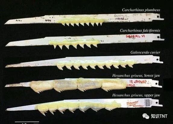 研究人员发现,鲨鱼的牙齿不单单是切开猎物这么简单,在切割猎物时,它们还伴随着其他部位的协作、合力,而这把特制的电锯则可以模拟出鲨鱼进食时的整个过程。通过研究表明,虎鲨、丝鲨牙齿的锋利程度是最高的,但与之相对应的,它们的磨损程度很大,而铅灰真鲨和钝鼻六鳃鲨则正好与之相反,锋利程度和磨损程度较弱。鲨鱼之间的咬合力也存在巨大差异,并且,它们的磨损程度也是和咬合力的强弱成正比,而这也告诉我们为什么鲨鱼的换牙会如此的频繁。