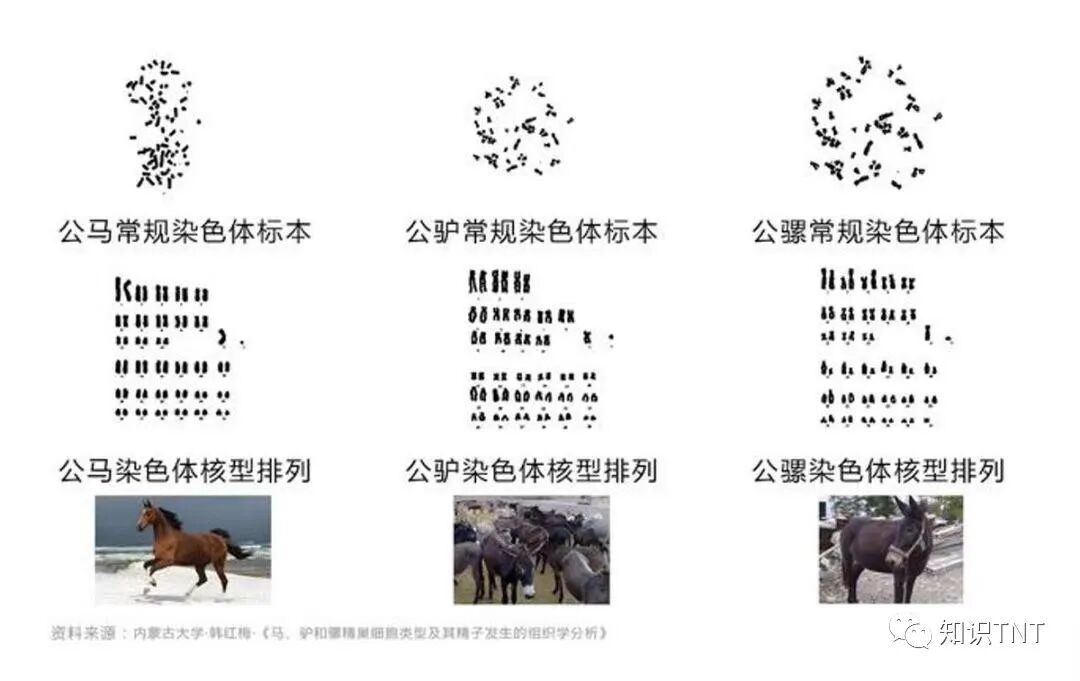 再来看马和牛,马有染色体64条,水牛有48条。就算交配成功,他们之间的染色体数量相差过大,也会导致它们无法结合出有用的受精卵。