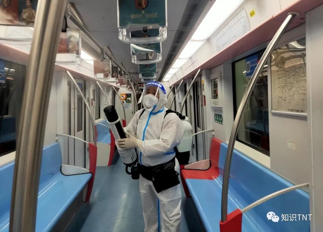 这个过程,一般都在列车停库的晚上11点到2点之间进行,全列车的通风系统关闭,在一个密闭的环境中,用药水喷洒的办法,对整个列车进行消毒处理。