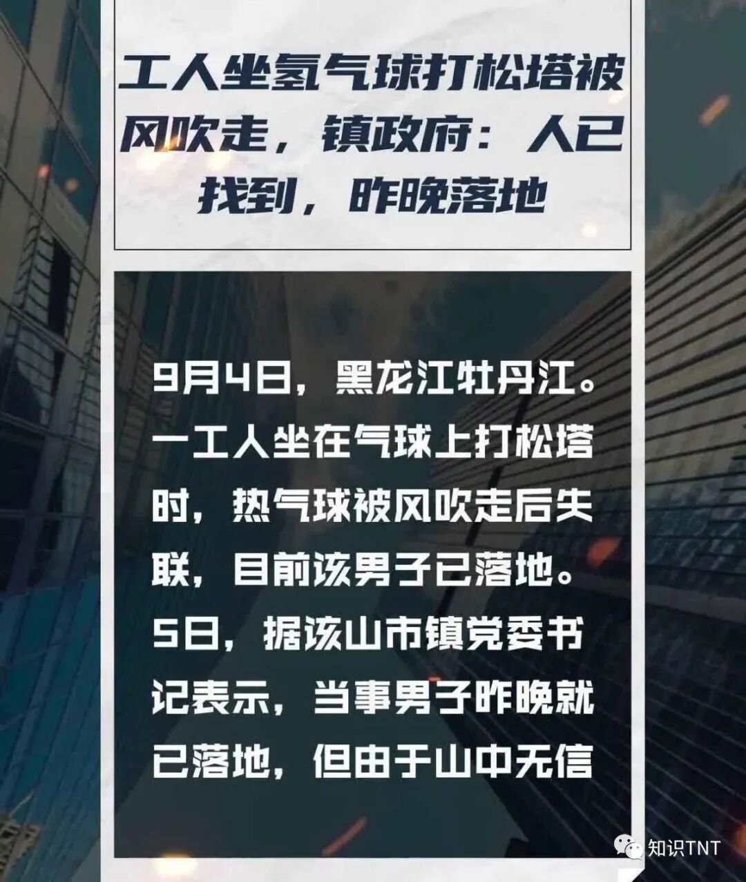 9月4日下午,辽宁籍工人胡泳旭,和工友刘成会一起乘氢气球升到几十米的高度,正围着几株松树进行采摘,突然感觉氢气球出现明显颠簸。当他们意识到不对劲时,企图操控设备降落时,氢气球却“不听使唤”地向上缓缓飘去。