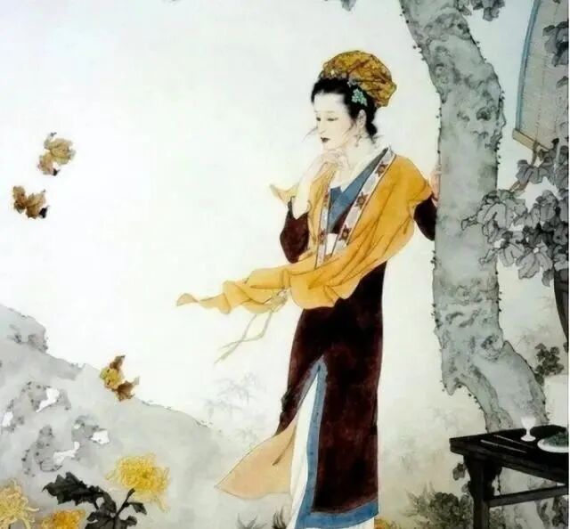 沈从文先生在《中国古代服饰研究》一书中指出画中女子梳高冠髻,穿小袖对襟旋袄,下着长裙。
