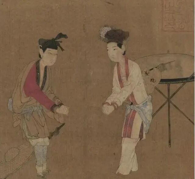画中两位侍女下身也穿有同样式的裆裤。南宋佚名小品画《蕉荫击球图》、南宋李嵩《骷髅幻戏图》同样可见着裆裤的女性形象从图中可以看到裆裤侧面开衩处有自上而下的褶裥设计,当褶裥展开时,裆裤的喇叭形态清晰可见。