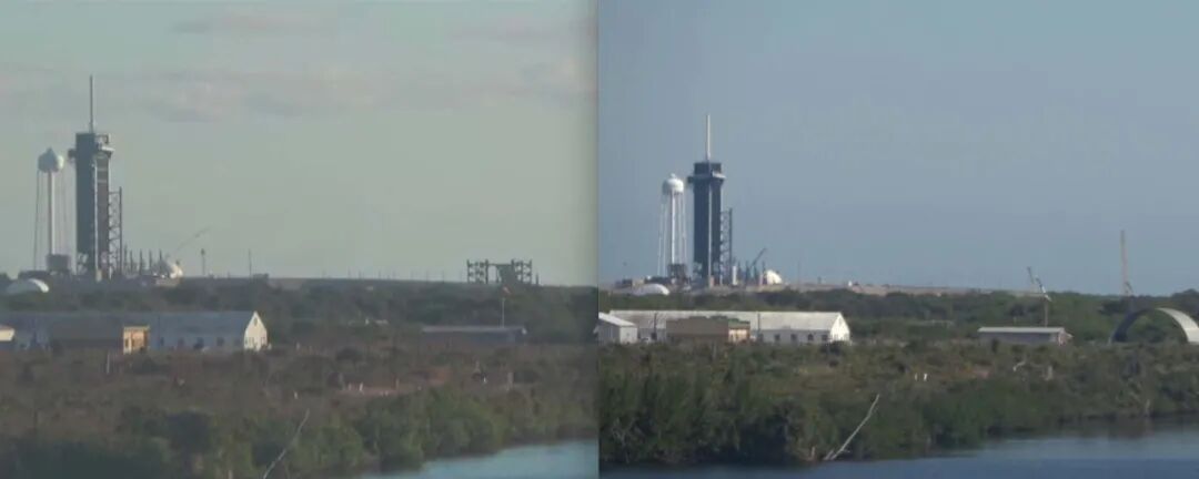 2020年12月39A的前星际飞船发射架(左) ,以及2021年12月39A发射台(右)的视图,亚轨道发射台从发射场移除。