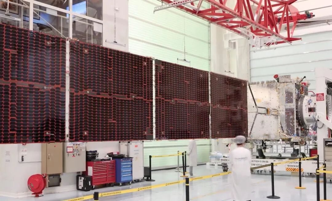上图为埃及的尼罗河301号通信卫星进行太阳能电池板的地面展开测试。