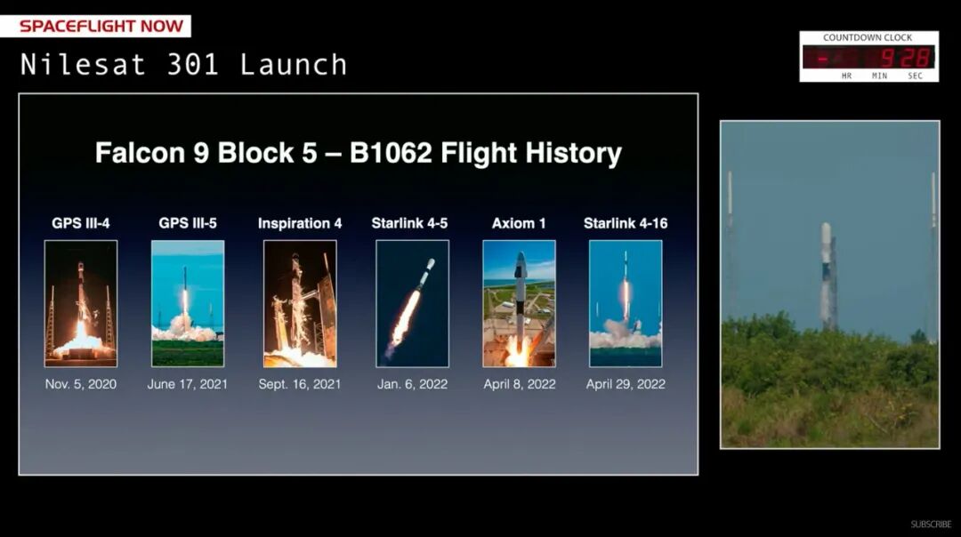 本次发射使用的是一枚七手猎鹰九号火箭。火箭编号为B1062.7,该火箭发射历史数据如下: