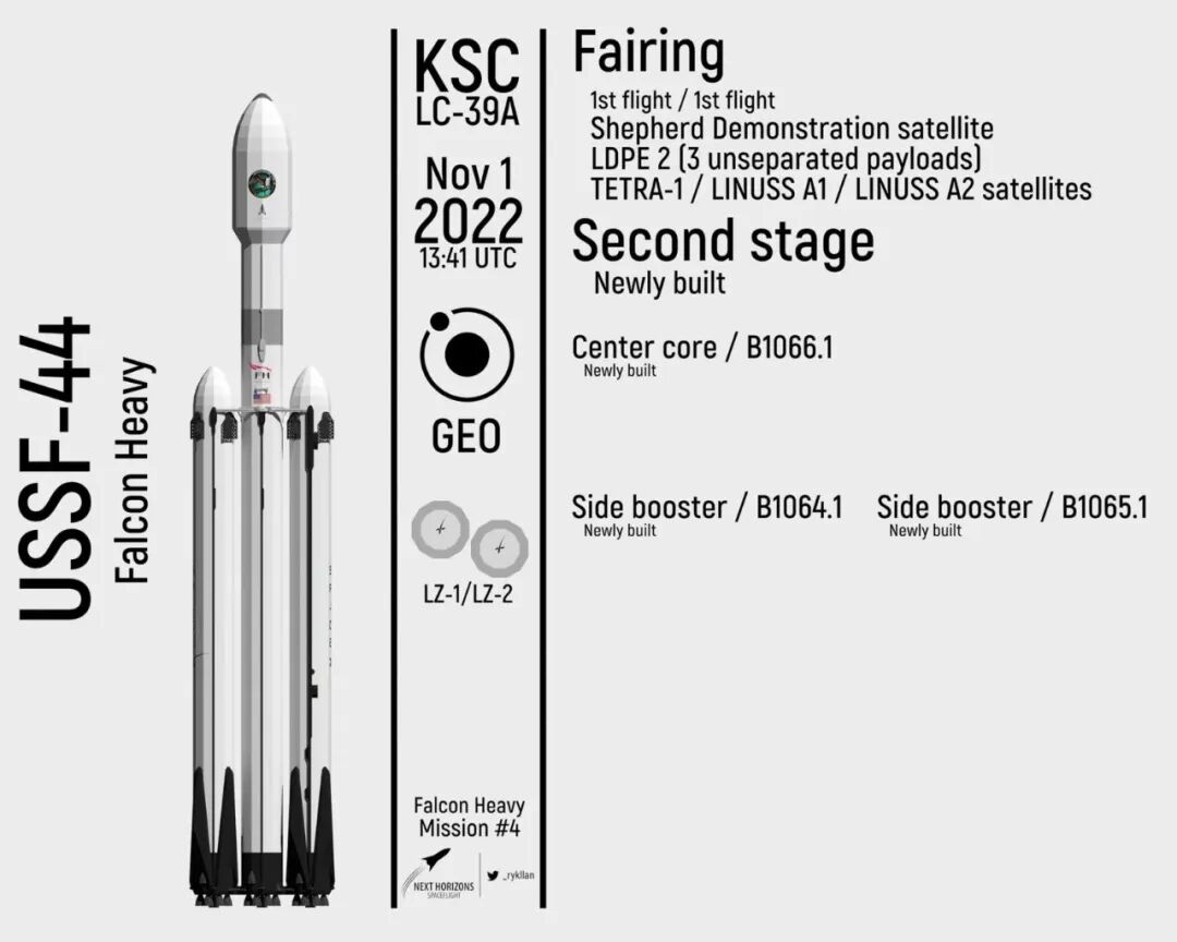 太空部队对这次发射设置代号为USSF-44。猎鹰重型火箭是现役飞行火箭中运力最强大的火箭。这次发射将是 SpaceX 公司猎鹰重型火箭首次完全正式运行的国家安全任务。猎鹰重型火箭最近一次发射是在2019年6月,它携带了军方和 NASA 的24颗实验卫星,代号为空间测试计划-2(STP-2)任务。STP-2任务认为是猎鹰重型火箭未来发射更重要的国家安全载荷前的一次示范飞行。