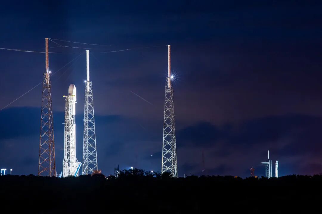 该照片显示位于佛罗里达州太空海岸的40号发射台和39A发射台的两枚猎鹰9号火箭