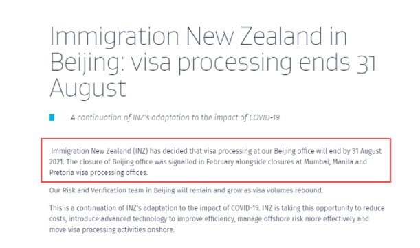 新西兰移民局6月1日确认,北京办事处将停止办理签证申请。