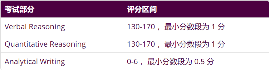 大部分 GRE 普通考试(General Test)均采用机考形式,包括三部分:分析性写作(Analytical Writing),词汇推理(Verbal Reasoning)定量推理(Quantitative Reasoning)三部分,满分346分,各部分具体评分放在下图↓。