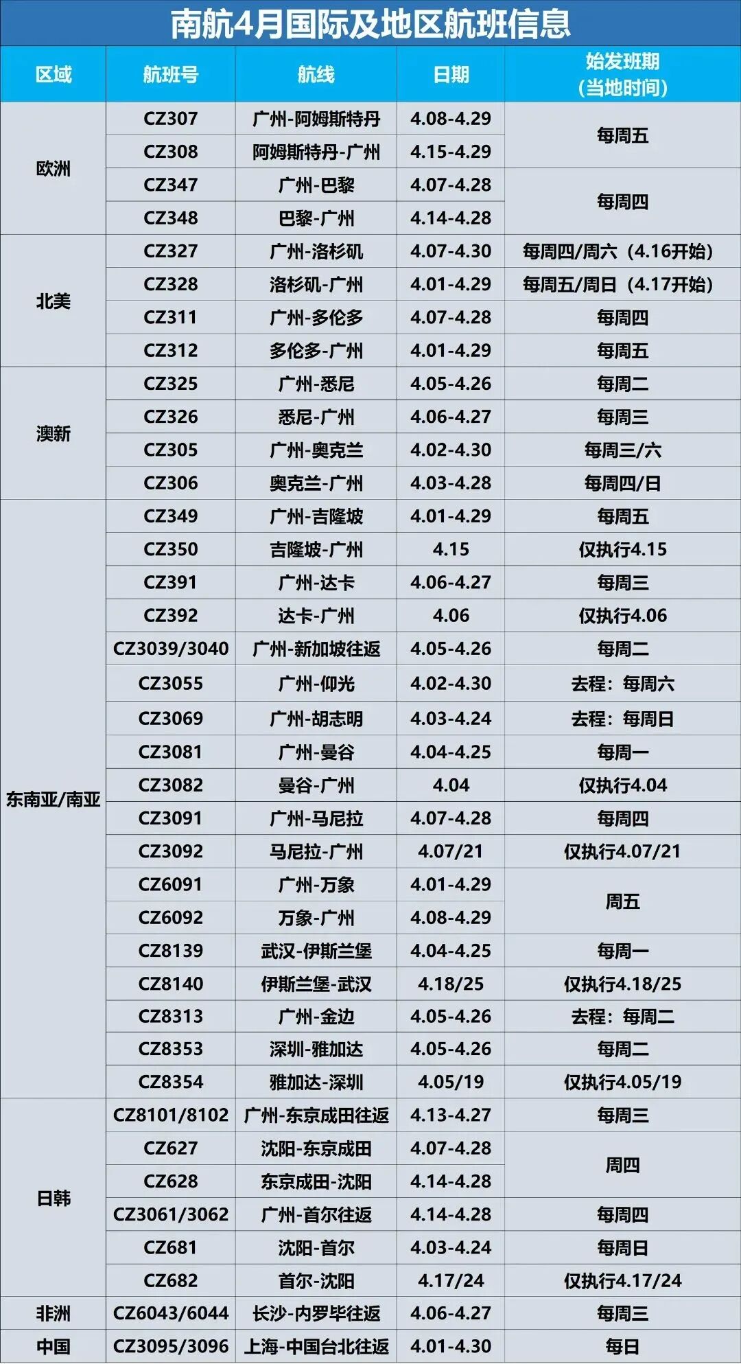4月,南航每周可执行国际及地区航线共计23条,具体航班计划如下: