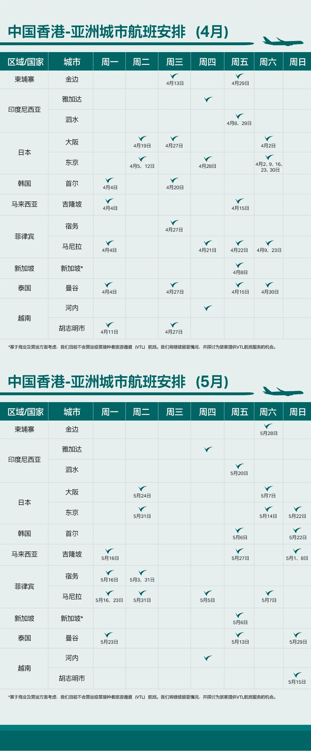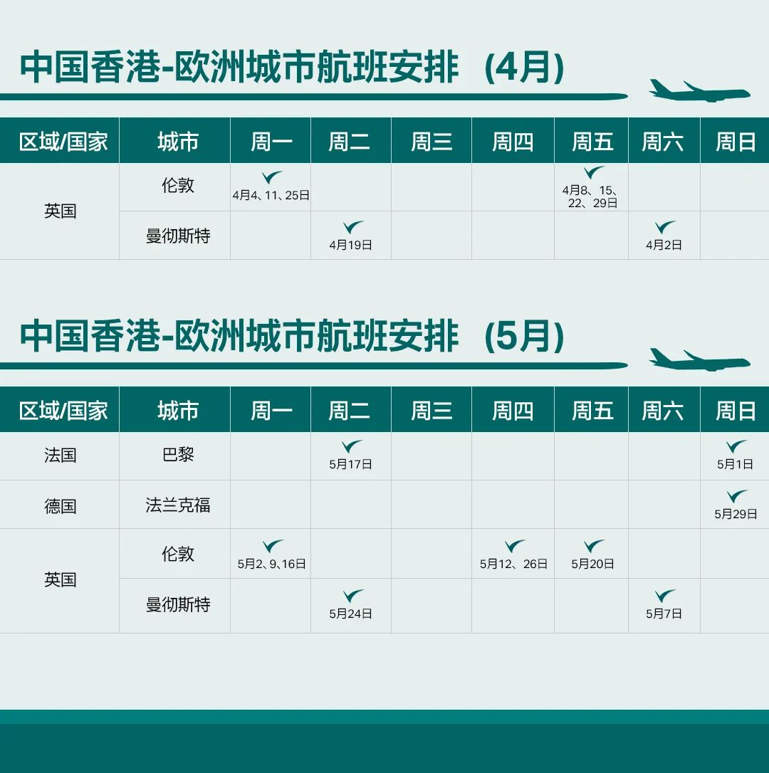 法兰克福往返香港:LH796(法兰克福至香港)航班暂停运营至 5 月 31 日;LH797(香港至法兰克福)航班暂停运营至 6 月 1 日。