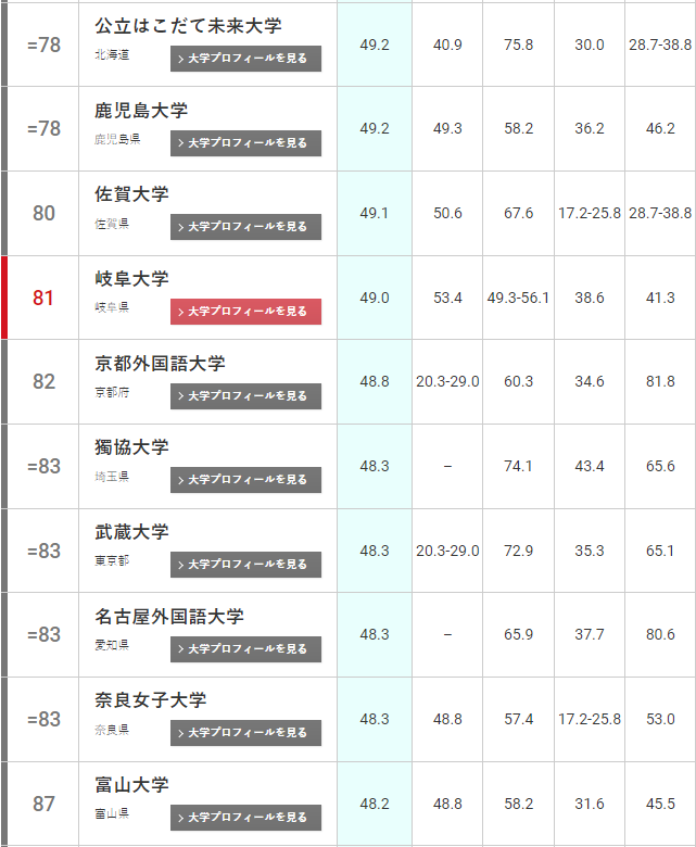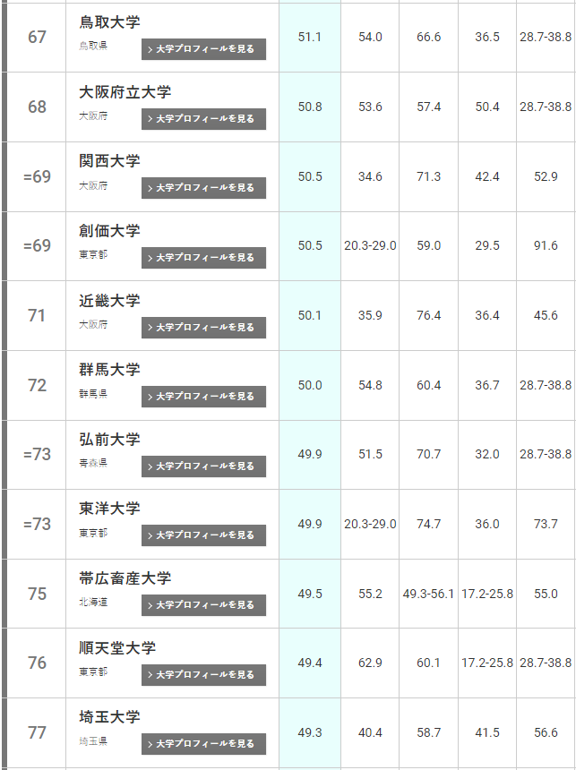 这是自2017年3月起,THE 第六次发布此排名。本次排名共包含了 273 所日本大学,其中国立大学 67 所,公立大学 42 所,私立大学 164 所。