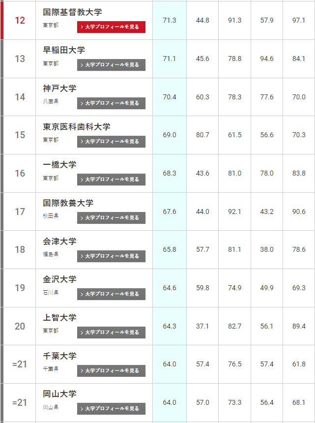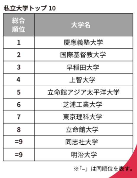 而私立大学这边,庆应义塾大学位列私立大学第 1,榜单整体排名11位;其次是国际基督教大学、早稻田大学、上智大学、立命馆亚洲太平洋大学。